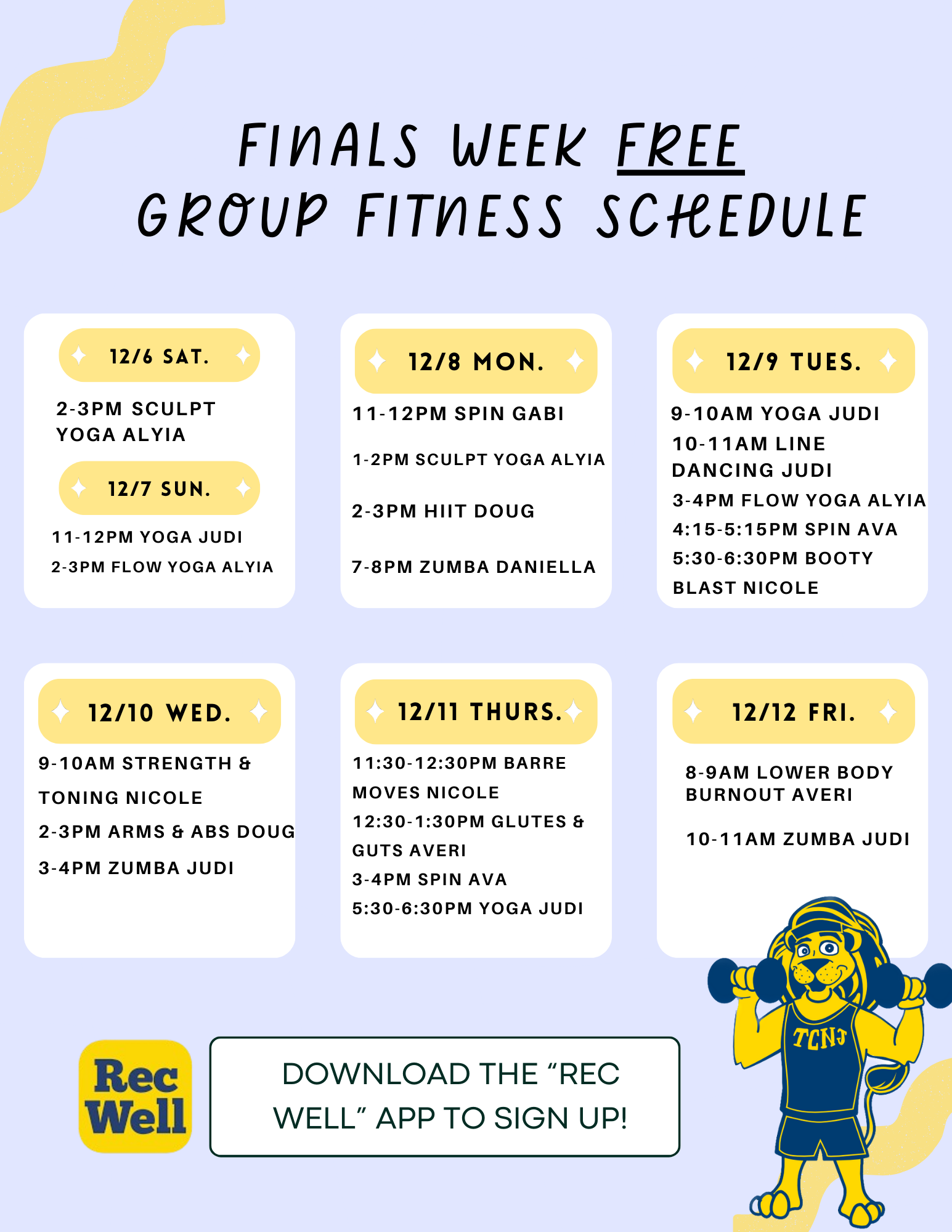 - Once your account is created, please use this step by step tutorial regarding how to sign up for free group fitness classes on the app. **Free classes are the trial period when school begins, as well as classes offered during Finals Week**